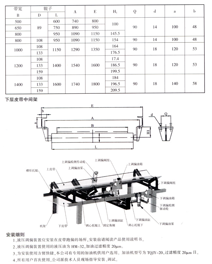 3、液压调偏装置根据皮带机的胶带有上下两种,分为上皮带调偏装置和下皮带调偏装置两类。